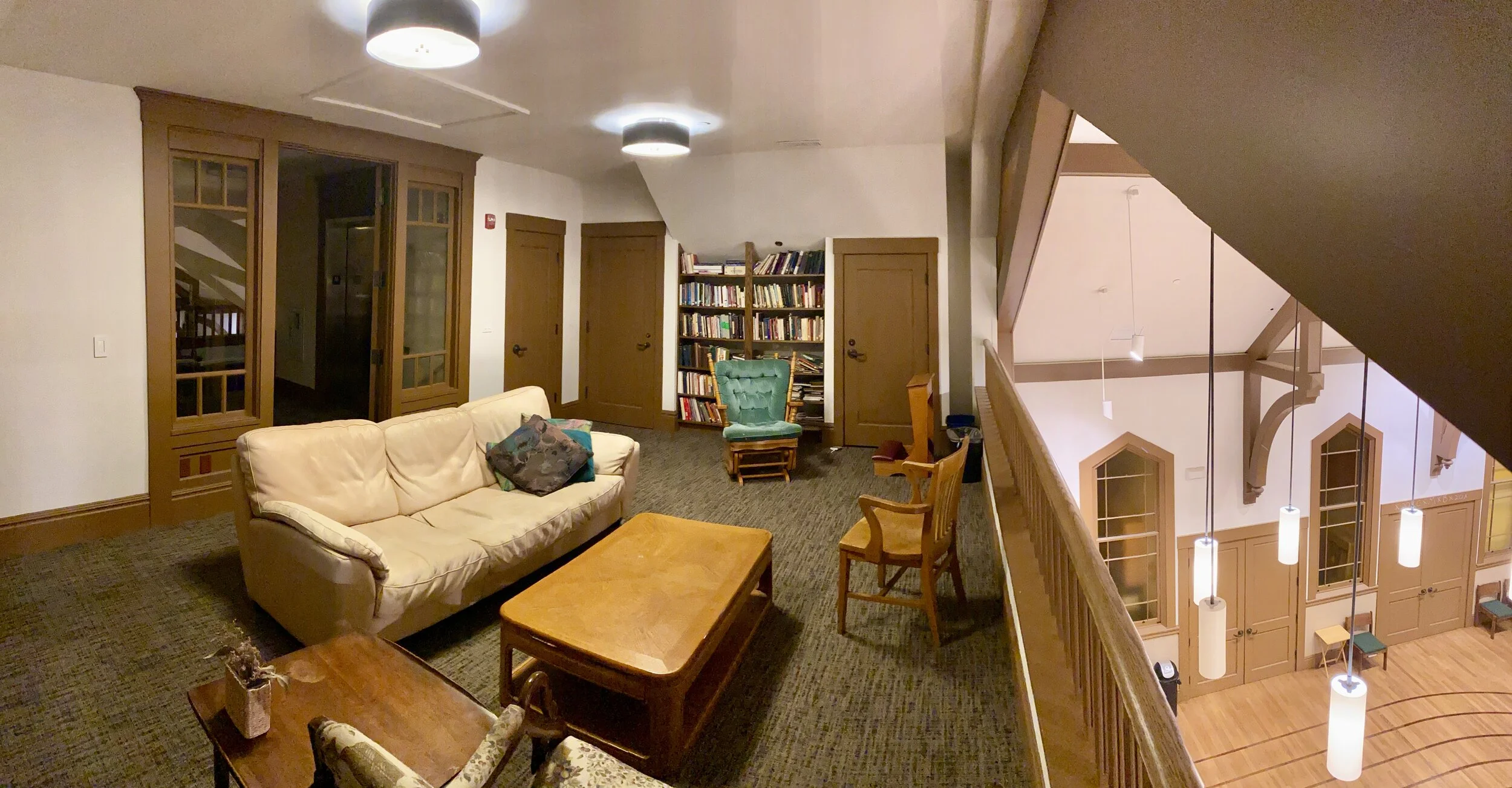 The Library/Mezzanine is 298 square feet. This room is set-up with a Lounge area. The room could be used for book groups or other discussion group. This room is on the third level of the building and opens up to the Sanctuary on the second level, so therefore does not allow for complete privacy. Capacity for this space is 15 people. 1 GB Wifi and wired internet access available. The Mezzanine can also be used as a green room or bridal room for events scheduled in the Sanctuary or Labyrinth Hall.